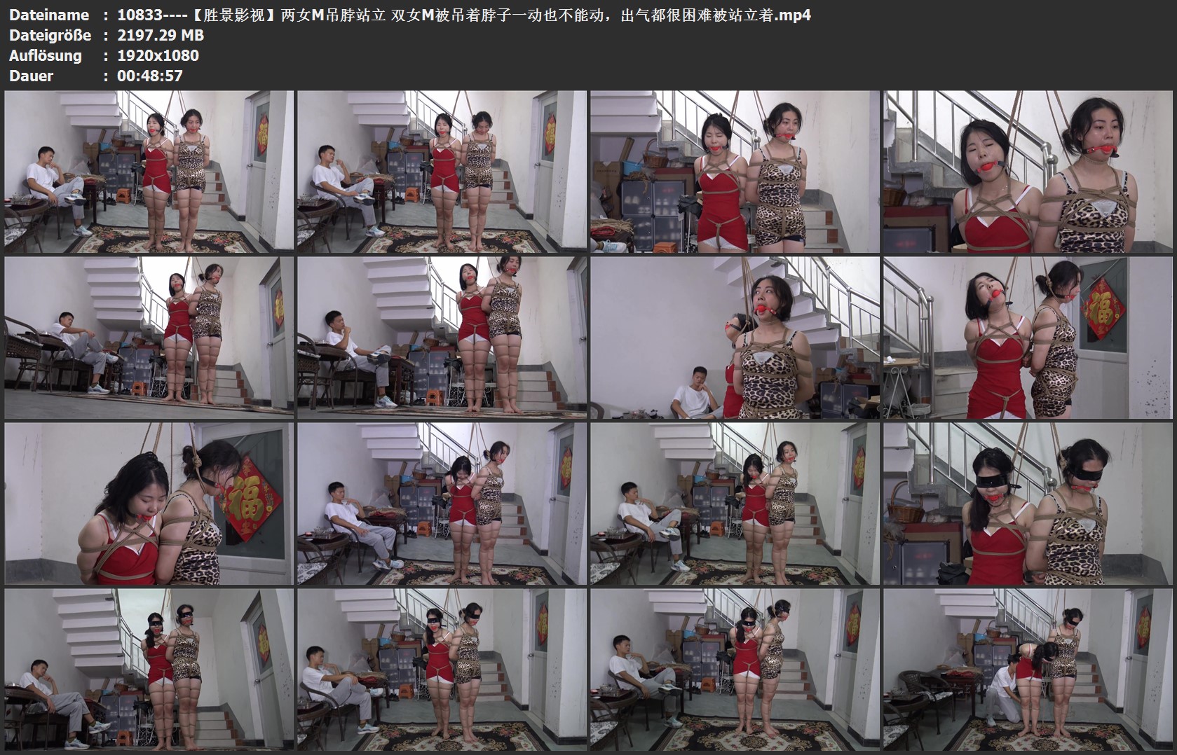 【胜景影视】两女M吊脖站立 双女M被吊着脖子一动也不能动,出气都很困难被站立着